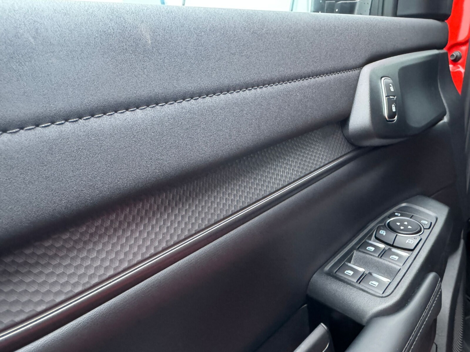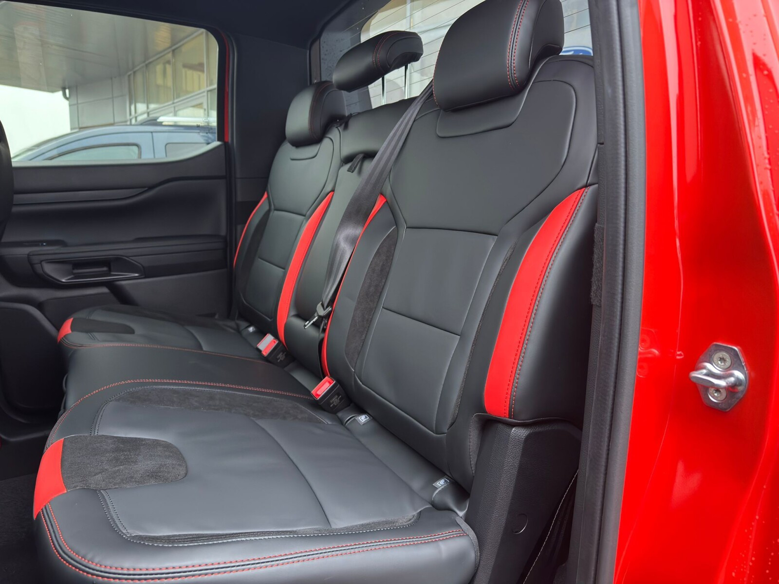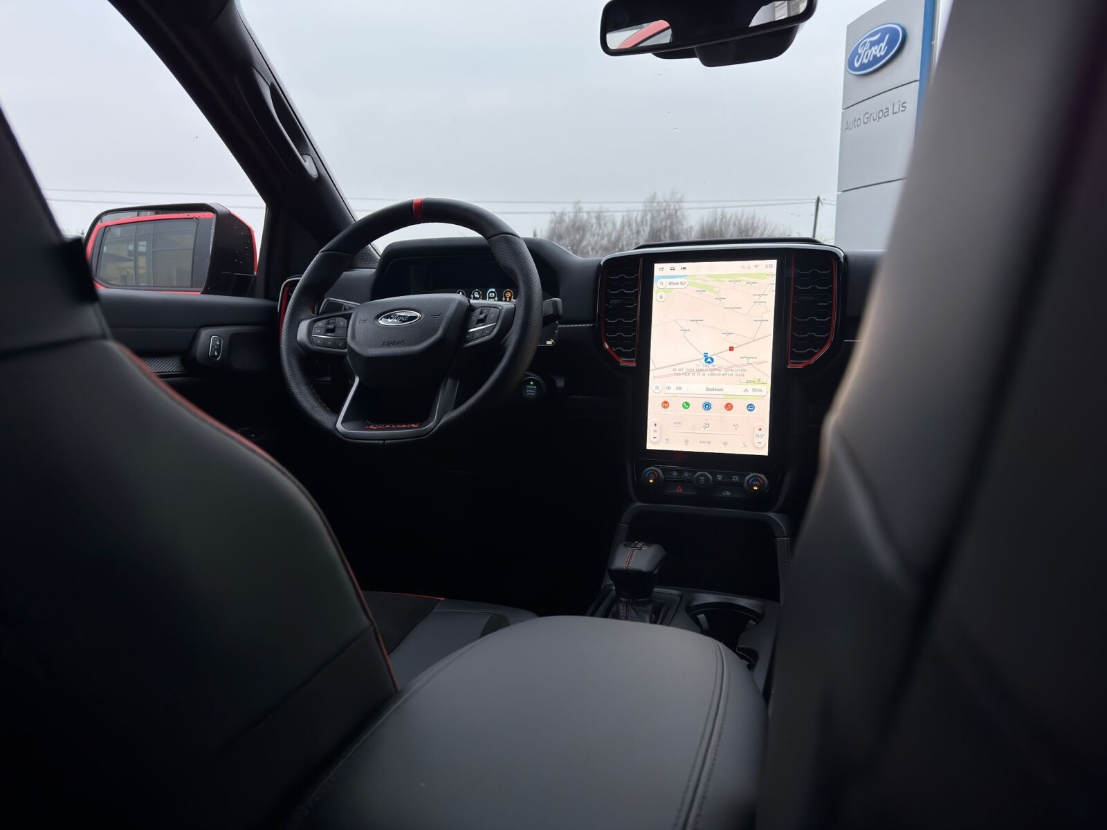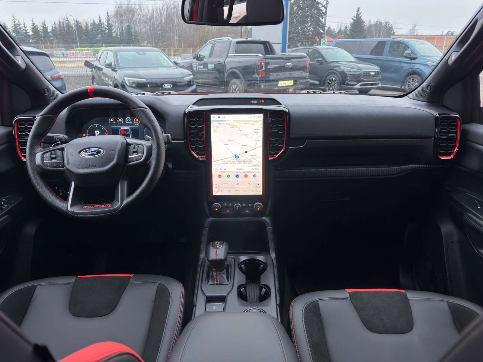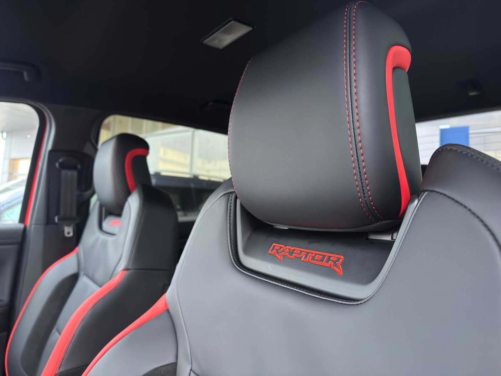 ◾Elektrycznie regulowane przednie fotele: fotel kierowcy regulowany w 10-ciu kierunkach (przód/tył, pochylenie oparcia, wysokość, nachylenie siedziska i podparcie odcinka lędźwiowego), fotel pasażera regulowany w 8-miu kierunkach z tapicerką skórzaną z logo Raptor, oraz funkcją przypominającą o zapięciu pasów bezpieczeństwa z przodu i z tyłu pojazdu.