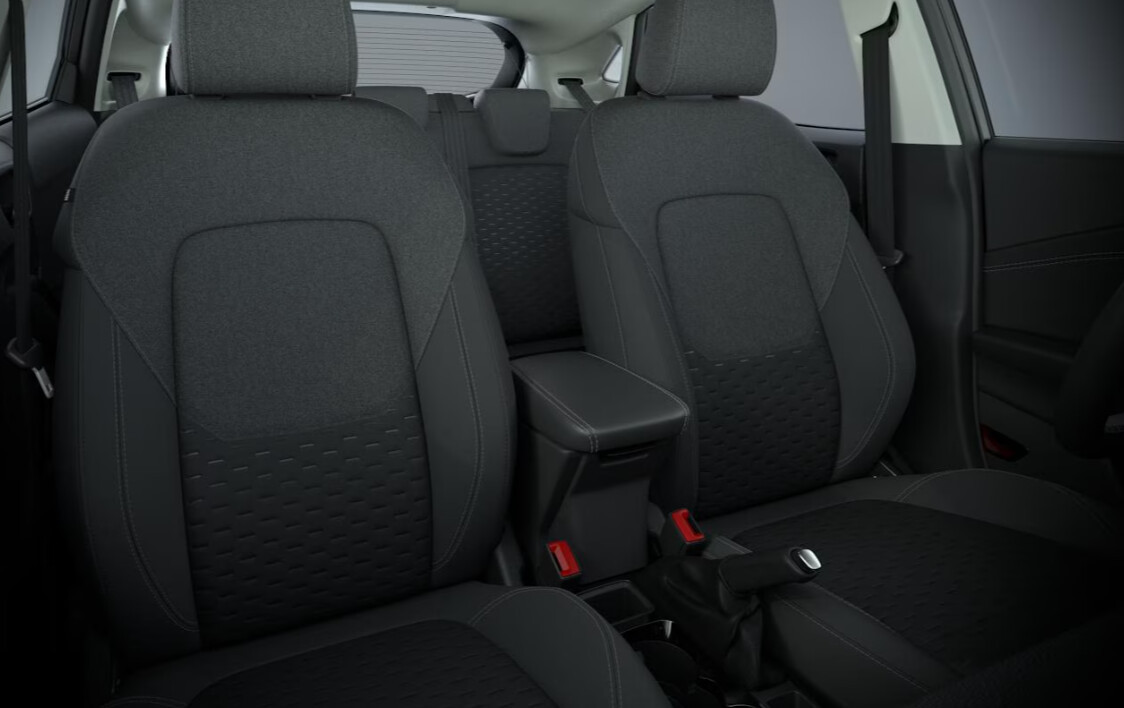 ◾Przednie fotele – z tapicerką materiałową Eton/Baku w ciemnej tonacji, z przeszyciami w kolorze szarym, styl sportowy